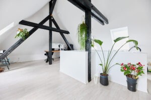 ist die Maisonette-Wohnung im Dachgeschoss rechts, die durch ihre offene Gestaltung und den sichtbaren Balken charaktervollen Charme versprüht. Die offene, obere Ebene mit ihren sichtbaren